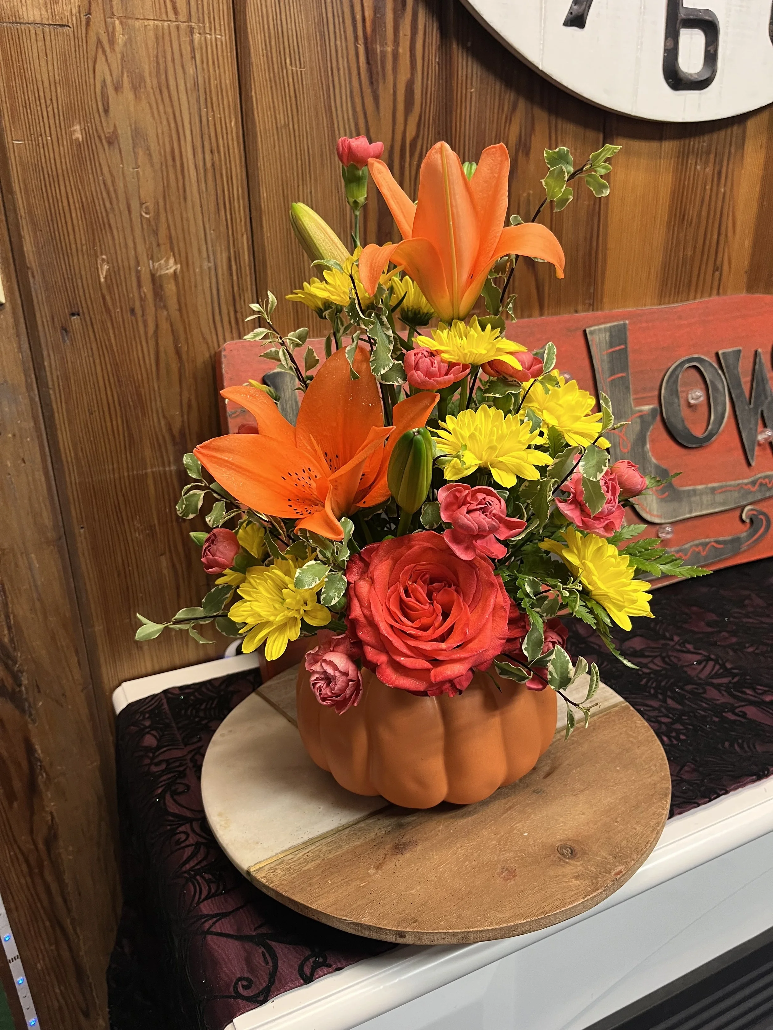 Fresh fall arrangement in a ceramic pumpkin vase
